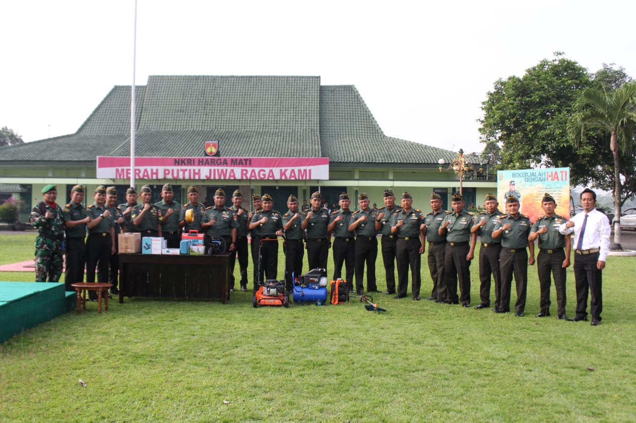 Bantuan yang diberikan meliputi mesin pemotong rumput, senso (chainsaw), alat bor, serta sejumlah peralatan kerja lapangan lainnya yang diharapkan dapat menunjang pelaksanaan tugas sehari-hari kelompok TUUD, khususnya dalam pemeliharaan dan perawatan sarana serta lingkungan satuan.